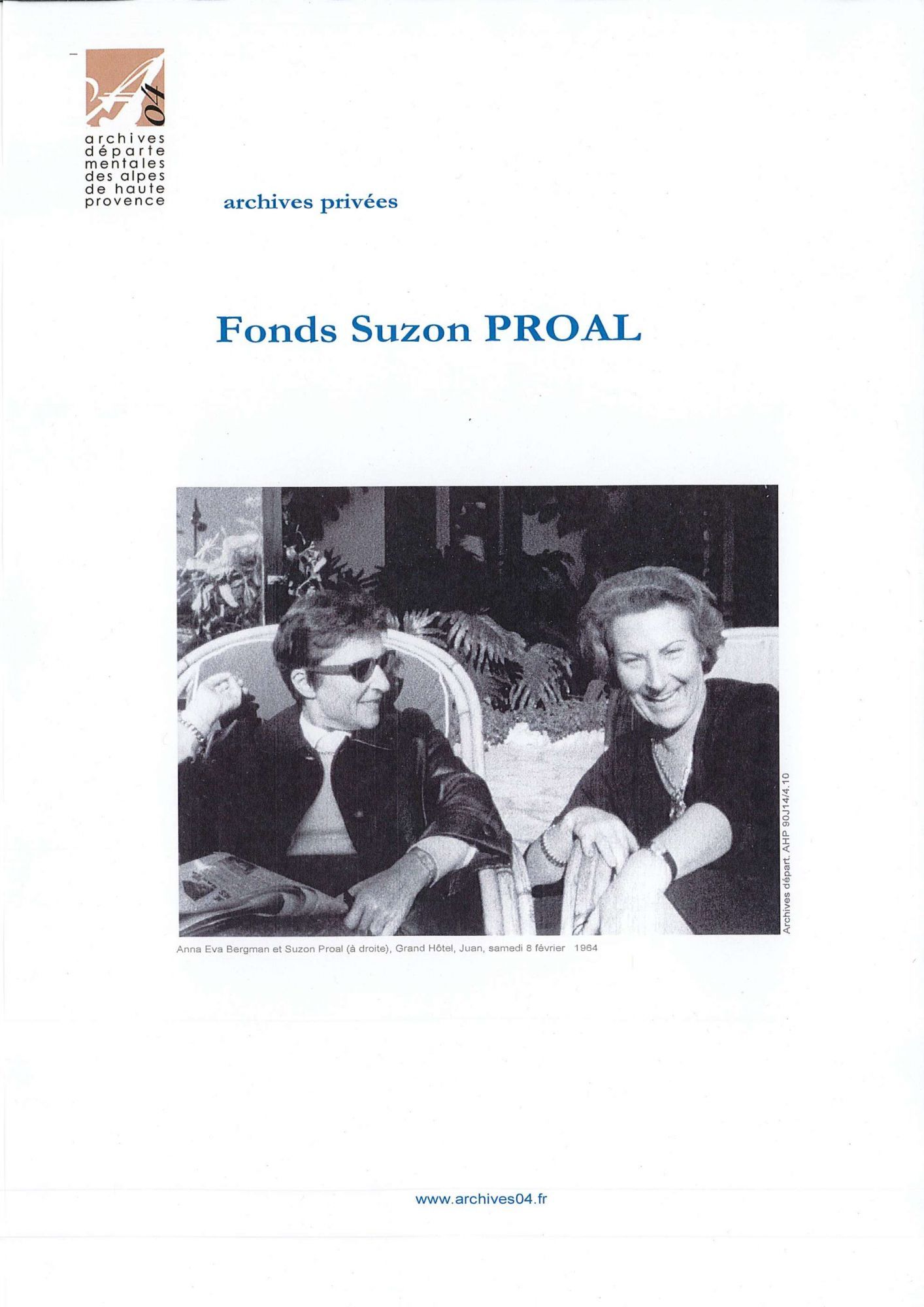 Le fonds Suzon Proal couvre la période 1921-1992 et permet d’évoquer la vie qu’elle a mené avec l’écrivain Jean Proal depuis leur rencontre dans les années 1950. Il s’articule en quatre parties : les papiers, la correspondance, les œuvres et adaptations de Jean Proal, les photographies et les objets.