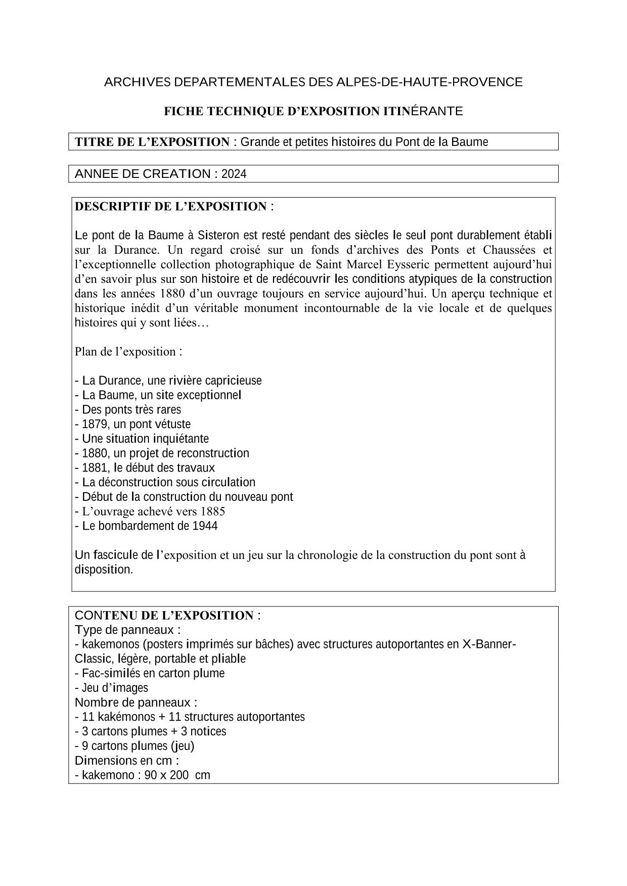 Le pont de la Baume à Sisteron est resté pendant des siècles le seul pont durablement établi sur la Durance. Un regard croisé sur un fonds d'archives des Ponts et Chaussées et l'exceptionnelle collection photographique de Saint Marcel Eysseric permettent aujourd'hui d'en savoir plus sur son histoire et de redécouvrir les conditions atypiques de la construction dans les années 1880 d'un ouvrage toujours en service aujourd'hui. Un aperçu technique et historique inédit d'un véritable monument incontournable de la vie locale et de quelques histoires qui y sont liées ...