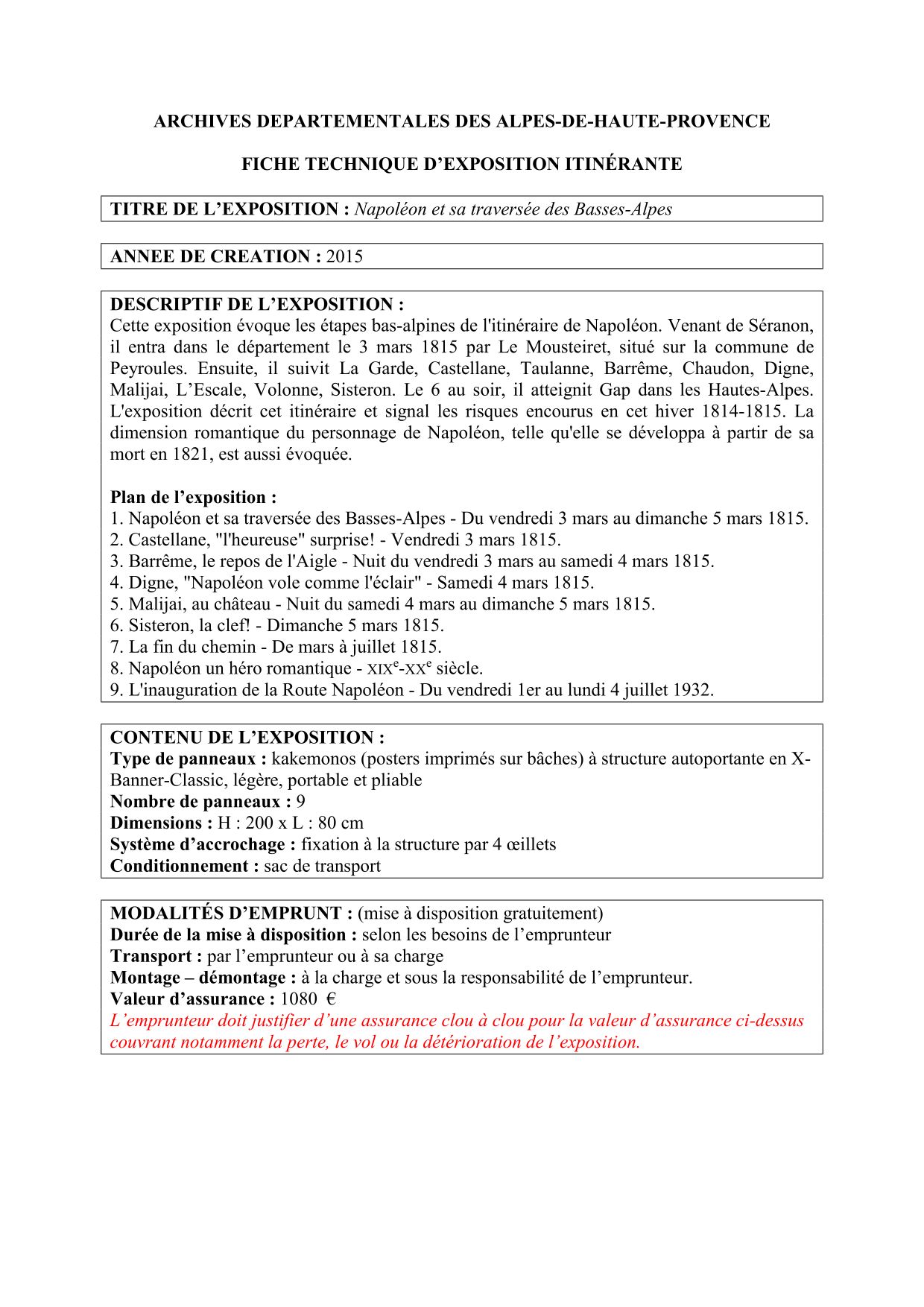 9 panneaux à structures autoportantes : les étapes bas-alpines et son itinéraire. Les risques encourus en cet hiver 1814-1815 et la dimension romantique du personnage de Napoléon, telle qu’elle se développa à sa mort, en 1891.