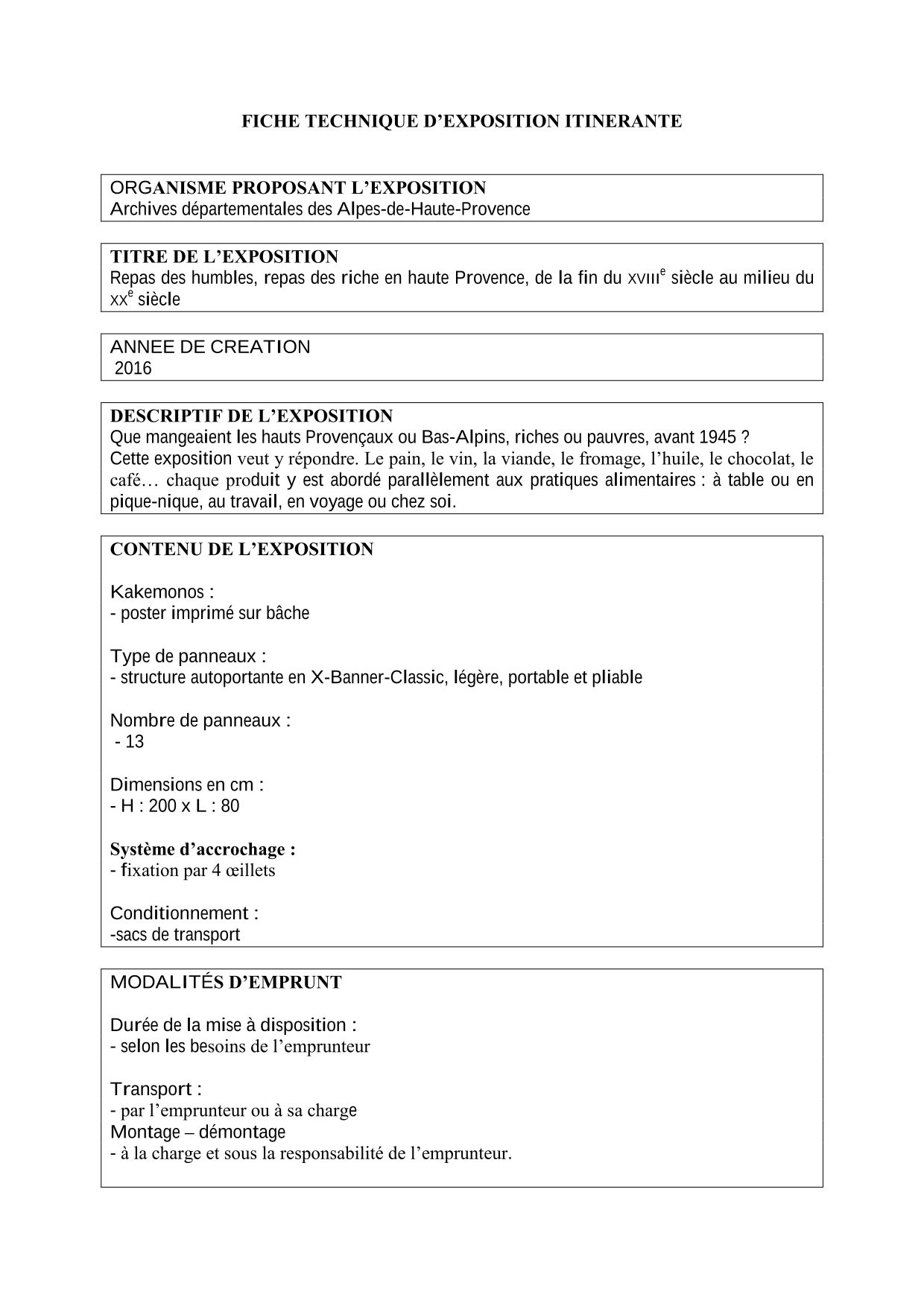 Elle est disponible au prêt pour les établissements scolaires du département. Elle se présente sous la forme de 14 kakémonos (200 x 80cm) sur structure autoportante : deux panneaux (introduction et conclusion), six panneaux sur le thème des produits (pain, vin et alcools, viandes, fromages, huiles, boissons coloniales), six panneaux sur le thème des pratiques (recettes, repas ordinaire, pique-nique, banquet, repas du voyageur, commerce des produis locaux).