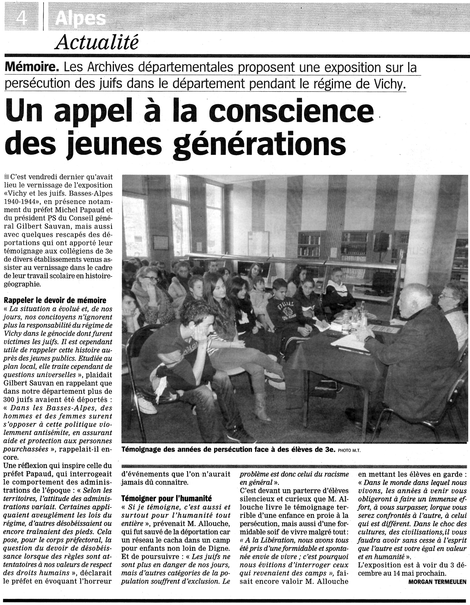 Les Archives départementales avaient déjà eu l’occasion de recevoir Gilbert Allouch lors de l’inauguration de l’exposition Vichy et les juifs. Basses-Alpes 1940-1944 présentée dans leurs locaux en 2012 (présentation du catalogue ICI )